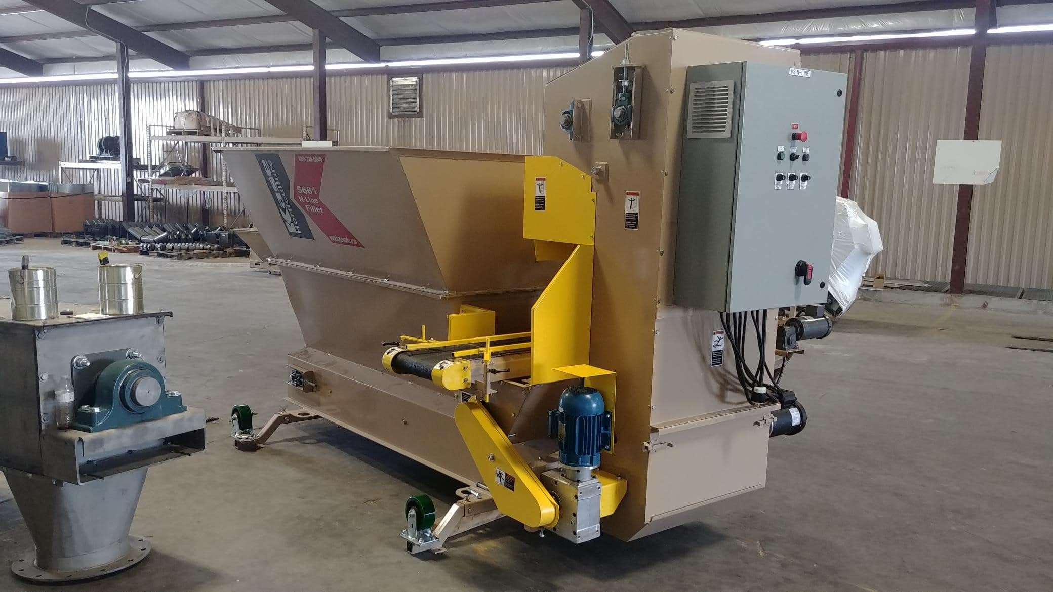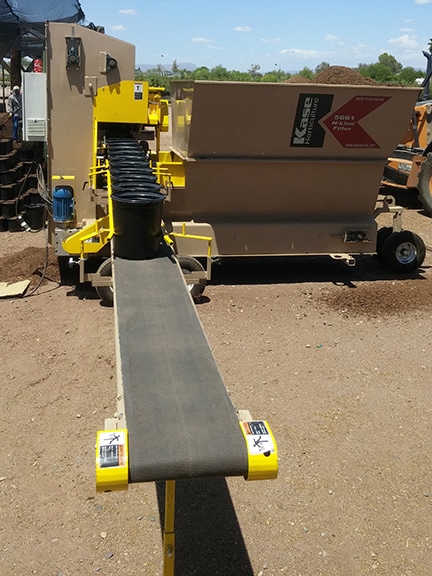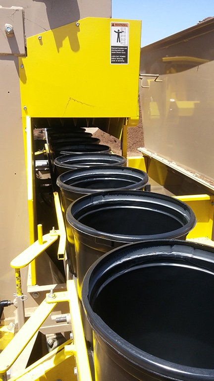 The KASE N-Line filler is a rugged machine, designed for growers who use a heavier, bark or sandy potting mix and who want to achieve a high production rate of filled pots or other containers. This machine is a workhorse and features a large hopper design, holding 4-Cubic Yards of potting media. This size hopper is ideal for filling directly from a Kase 2-yard or 4-yard mixer, freeing the mixer to blend another batch of soil.